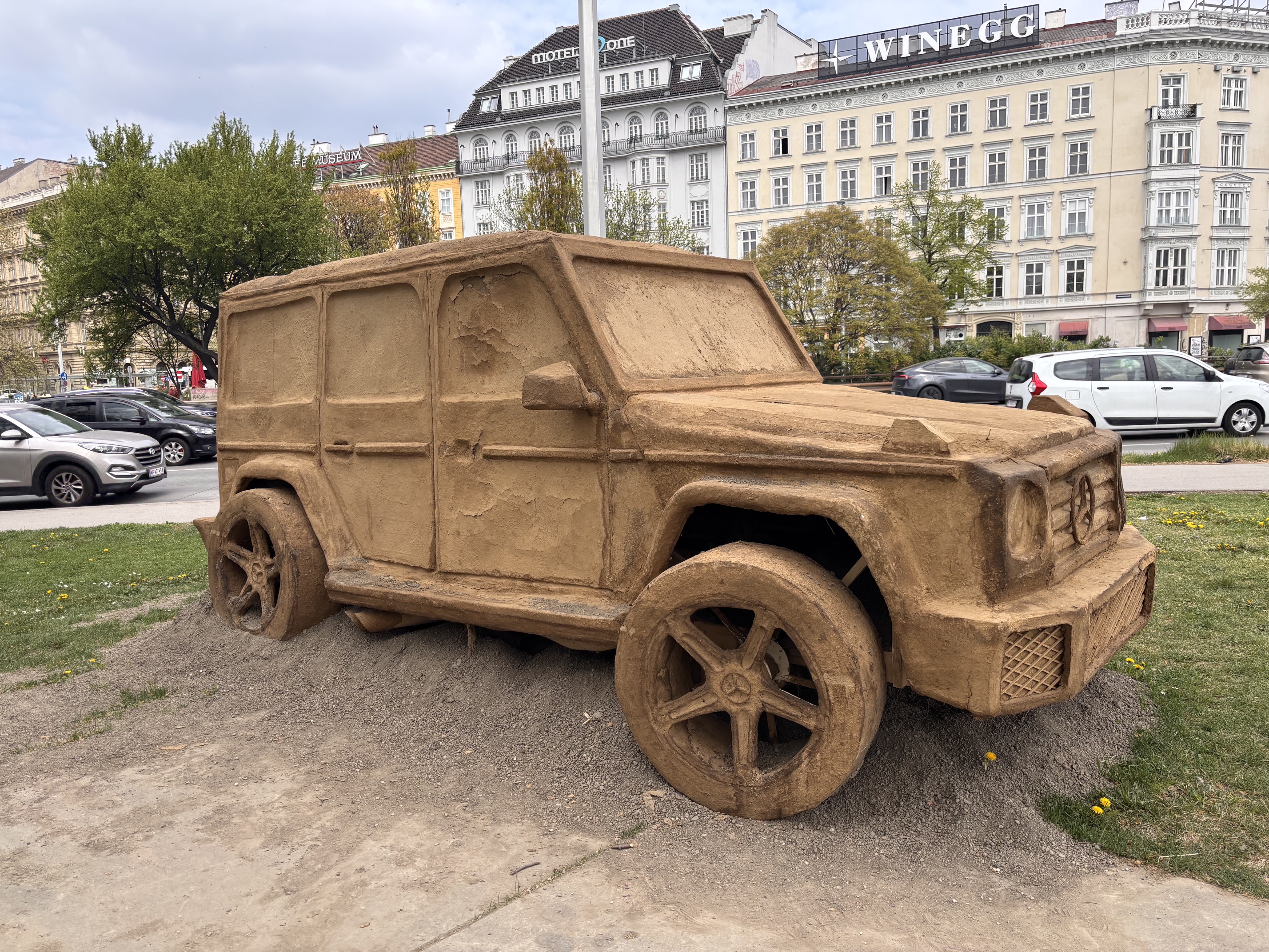 Die deutsche Künstlerin Folke Köbberling hat einen Luxus-Offroad-SUV aus kompostierbarem Stoff auf den Karlsplatz gestellt. Die Skulptur verottet nun langsam – als Protest gegen die Vorherrschaft der Autos im öffentlichen Raum.