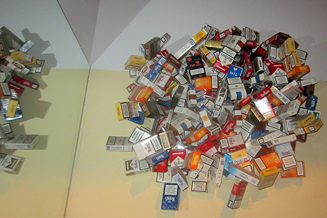 Was tun mit leeren Zigarettenschachteln? Eine kreative Möglichkeit wäre, die Packungen zu sammeln und Kunstobjekte daraus zu basteln. (Oder zumindest Dekorationsgegenstände.) Das Latte Grande in Wien verschönert den Zugang zum WC beispielsweise mit diesem Wandbild: