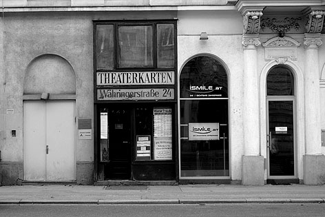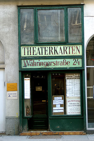 Das schönste Theaterkartenbüro Wiens befindet sich in der Währingerstraße 27. Hier können Tickets für Opernvorstellungen, Musicals aber auch Fußballländerspiele gekauft werden. Eigentlich gibt es auch einen Internetshop, aber das Ambiente dieses kleinen Geschäfts ist ein persönlicher Besuch wert. Das Theaterkartenbüro ist inzwischen so berühmt, dass es sogar als Motiv für Wien-Ansichtskarten dient. Hier zwei Fotos: Theaterkarten Theaterkarten