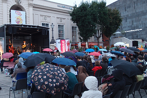 Ewas Regen und zarte Klänge – so startete am Donnerstagabend das Literaturfest O-Töne im MuseumsQuartier. Bevor Arno Geiger aus seinem neuesten Werk „Selbstporträt mit Flusspferd“ las, stimmte Sängerin und Gitarristin Mira Lu Kovacs mit ihrer Band Schmieds Puls das unter Regenschirmen zusammengekauerte Publikum ein. Anspieltipps auf Youtube: „You Can Go Now“ und „Play Dead“ (live @ Popfest).