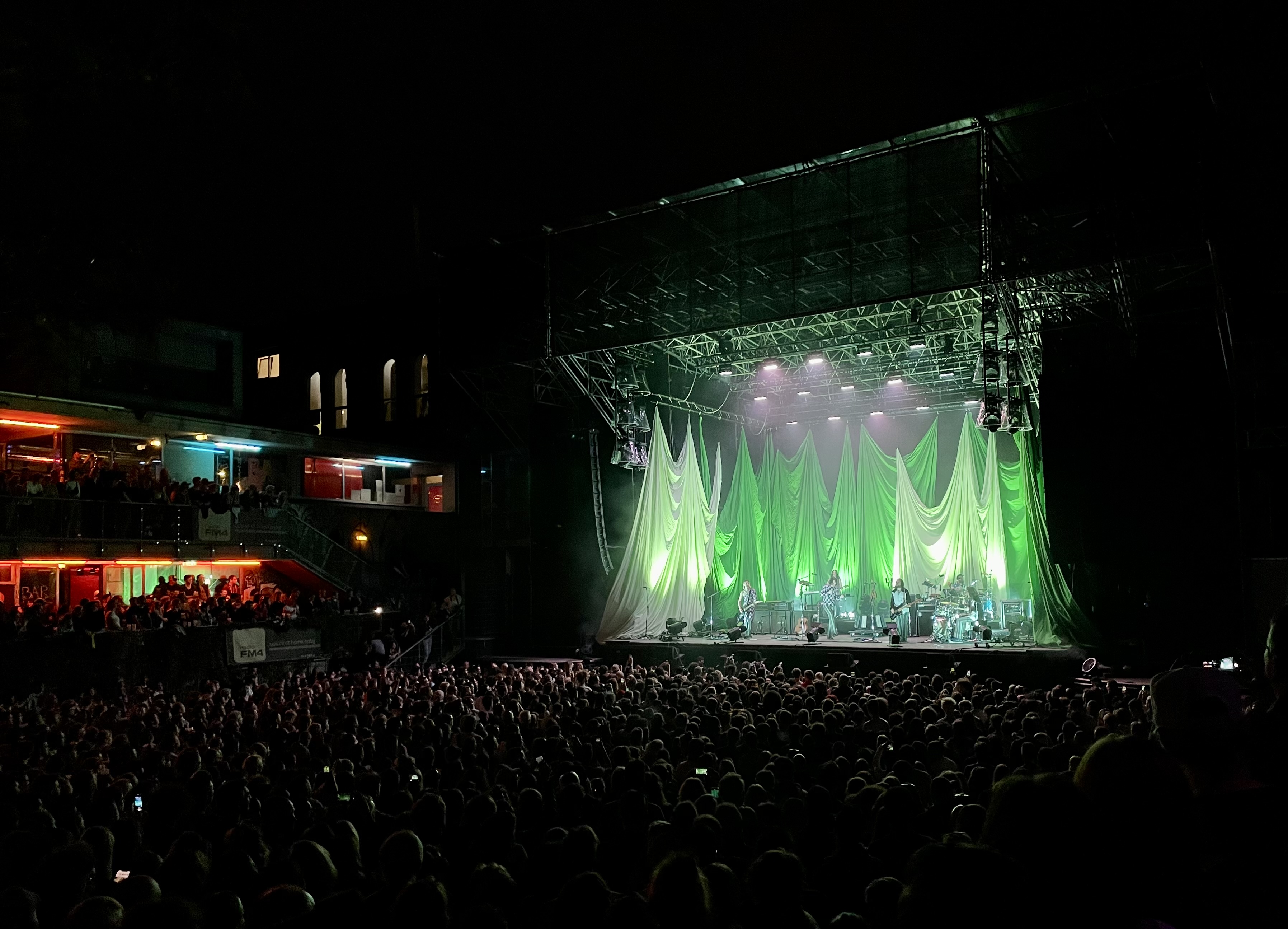Am Donnerstag hat alles gepasst – das Frühlingswetter, die beeindruckenden Gitarrensoli von Michael Krammer und die Mischung aus neuen (Nahuel Huapi) und älteren Hits (Maschin). Live ist die Band eine Klasse für sich. Zum Aufwärmen haben Bilderbuch die noch eher unbekannte 19-jährige Linzer Sängerin Uche Yara mit auf Tour genommen. Sie ist erstmals mit Band aufgetreten und hat daher „ausschließlich Uraufführungen“ gespielt. Funfact: Das neue Bilderbuch-Album „Gelb ist das Feld“ ist nicht nur digital, auf CD oder Vinyl erschienen, sondern auch als Kassette. Natürlich gibt es für Fans auch Band-T-Shirts (ab 40 Euro!). Vergebens sucht man am Merchandising-Stand allerdings – Bilderbücher.