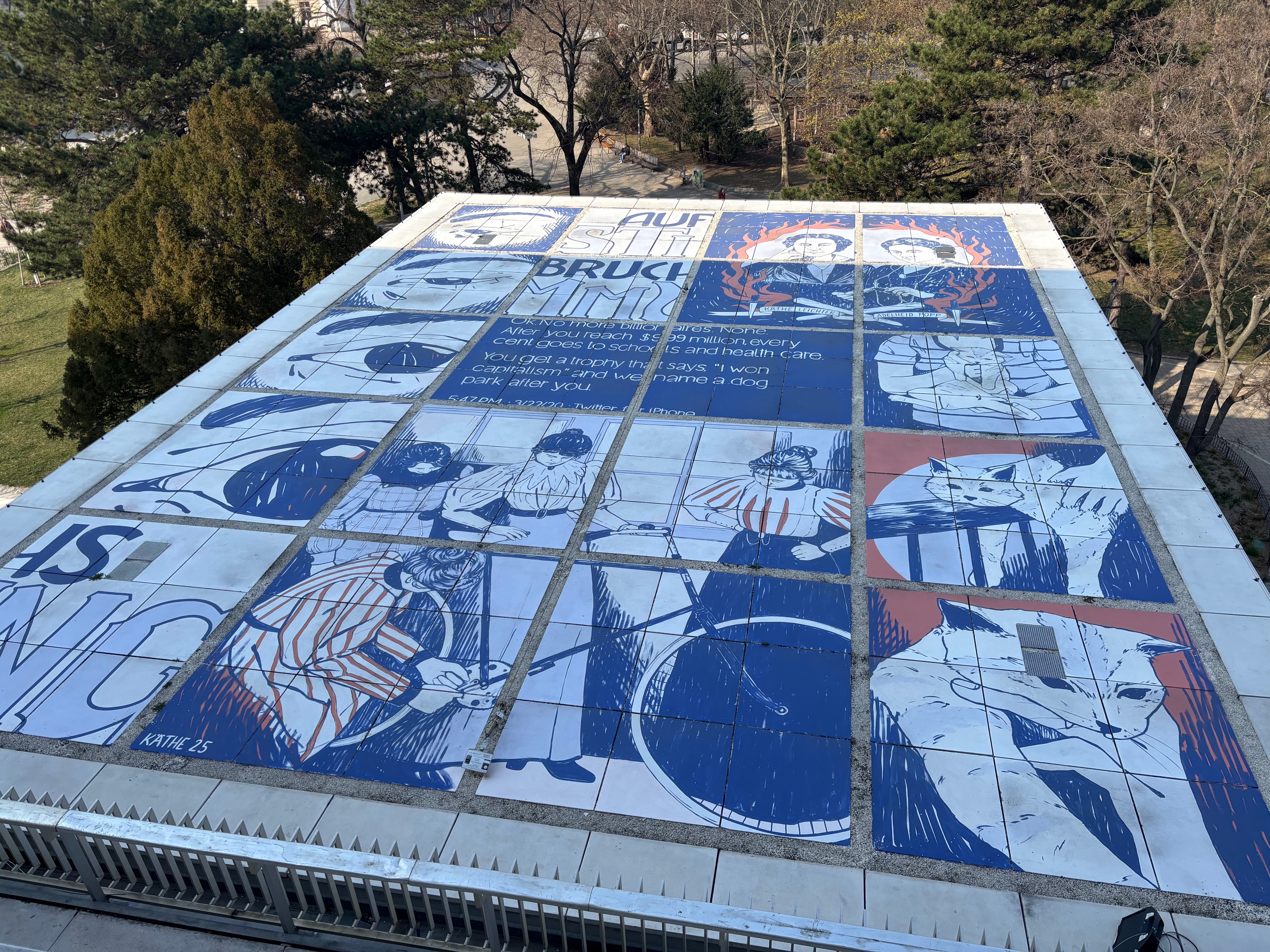 Der Schweizer Künster Reto Emch hat beim MuseumsQuartier unter dem Titel „Off-Balance“ sechs alte Bauschuttmulden aufstellen lassen, aus denen Farbe rinnt. Die Behälter wurden per Zug nach Wien transportiert und sollen den ökologischen Fußabdruck von Kunst thematisieren. „Kunstwerke werden über den ganzen Globus verschoben, denn die Museen möchten sich die Highlights teilen. Es ist ein Milliardengeschäft geworden, alle verdienen irgendwie mit. Off-Balance ist Ausdruck dessen, wie wir mit alldem umgehen“, so Emch. „Wir stehen auf der Kippe und befinden uns in Schräglage.“