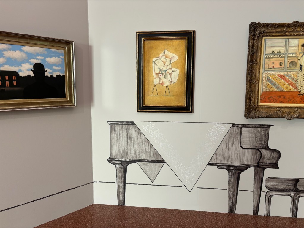 Neben der abgestimmten Glitzerkleidung der Künstler fallen dieses Jahr besonders die ausgefallenen Instrumente auf: Ist es eine Mini-E-Geige oder doch eine Gitarre, der Matthias Jakisic diese Töne entlockt? Er begleitet Peter Wolf beim Sinnieren über Pinot Noir. Vor dem Rubens-Gemälde „Cimon und Efigenia“ wird eine Gitarre mit zwei Hälsen bearbeitet und neben dem Mini-Bild „Maria mit Kind“ liefert eine Drehleier den Soundtrack zu den Freuden und Ängsten einer tatsächlich hochschwangeren Manaho Shimokawa. Das Instrument am Schoß von Verena Zeiner kennt man schließlich: Mit Keyboard begleitet sie einen Stopp Motion-Film über den Baby-Drachen, dessen Papa vom Heiligen Georg am Gemälde nebenan erstochen wurde.