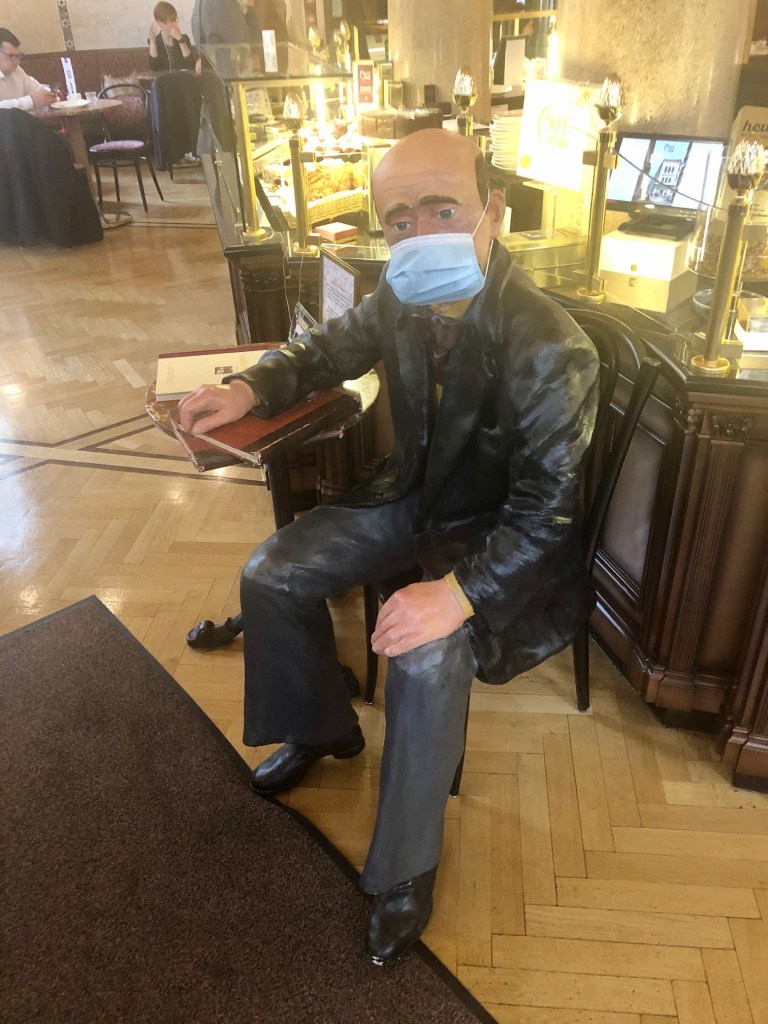 „Wenn er nicht im Café Central ist, ist er auf dem Weg dorthin“, wird über den Dichter Peter Altenberg geschrieben. Er soll das berühmte Kaffeehaus in der Herrengasse auch als seine Wohn- und Postadresse angegeben haben. Heute widmet ihm die Wiener Institution beim Eingang eine lebensgroße bemalte Sitzfigur. Während der aktuellen Coronavirus-Pandemie trägt sie einen Mund-Nasen-Schutz. Übrigens – auch im Wiener Rathaus befindet sich eine Altenberg-Pappmachéfigur, die Kaffee trinkt und Zeitung liest. Der alte Mann mit Schnauzer wird angeblich immer wieder von Gästen gegrüßt. Der unfreundliche Wiener grüßt aber nie zurück…