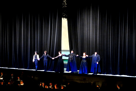 Diskutieren könnte man über die farblosen Kostüme (Annamaria Heinreich) und über das einfallslose Bühnenbild (Ferdinand Wögerbauer). Okay, es gibt auch mal einen mit Wasser gefüllten Pool auf der Bühne und es werden Leute auf dem Scheiterhaufen verbrannt. Aber es wird visuell nichts geboten, das einen so richtig vom Hocker haut. Das erledigt ausschließlich die Musik.