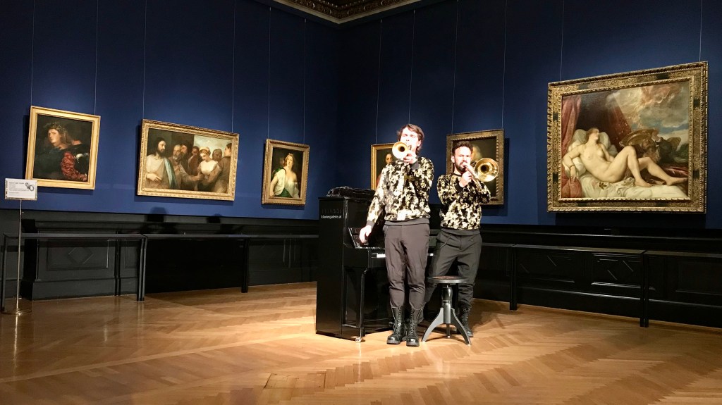 Absolutes Highlight: „Blech und Tizian“. Die Musiker Martin Eberle und Martin Ptak sind zwar schon Ganymed-erprobt, mit Trompete, Posaune und Klavier heuer aber besonders gefordert. Ihre mächtigen Blech-Episoden sind auch vor dem Besuch beim Tizian-Gemälde den ganzen Abend immer wieder durch die gesamte Gemäldegalerie zu hören.