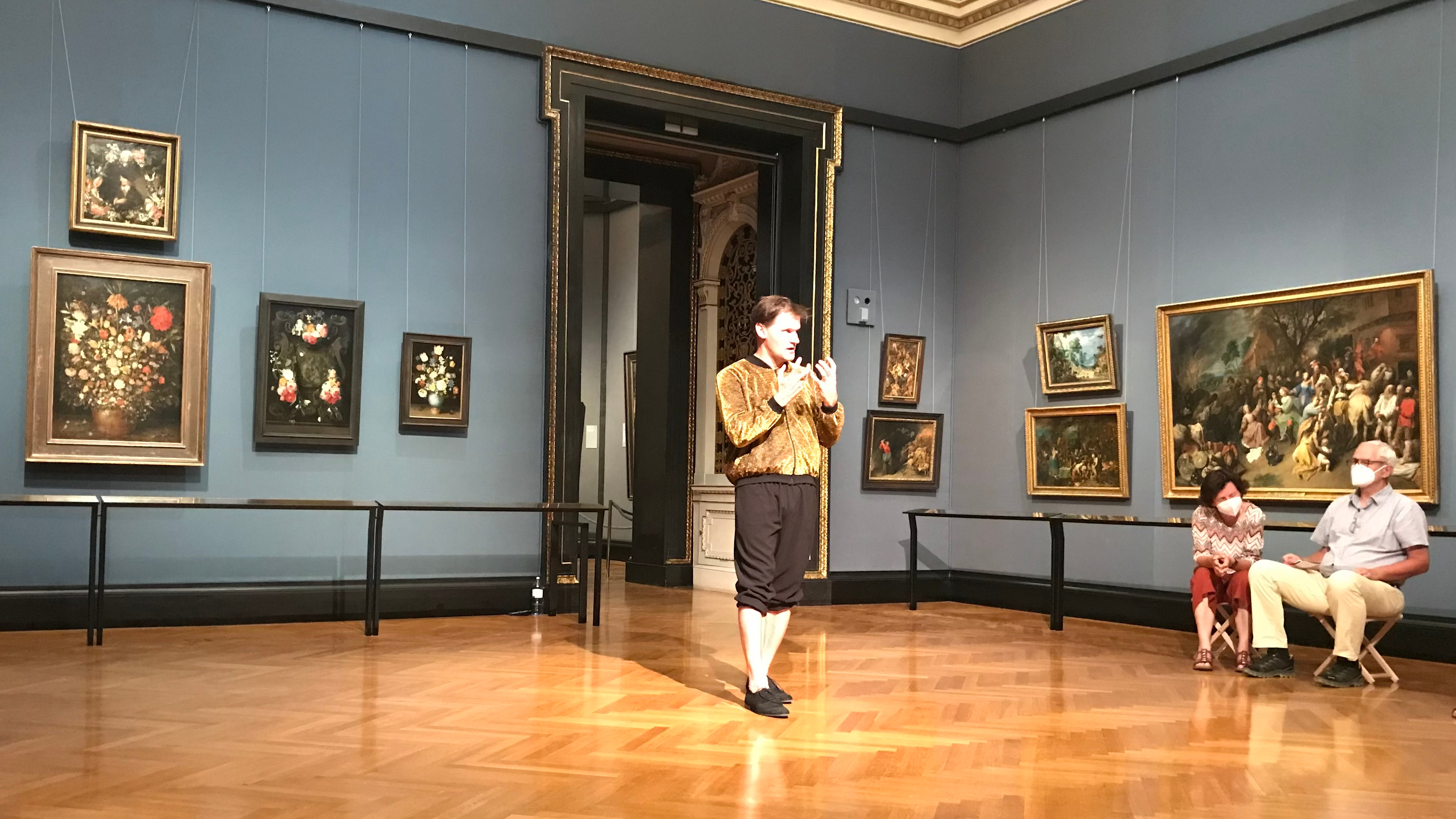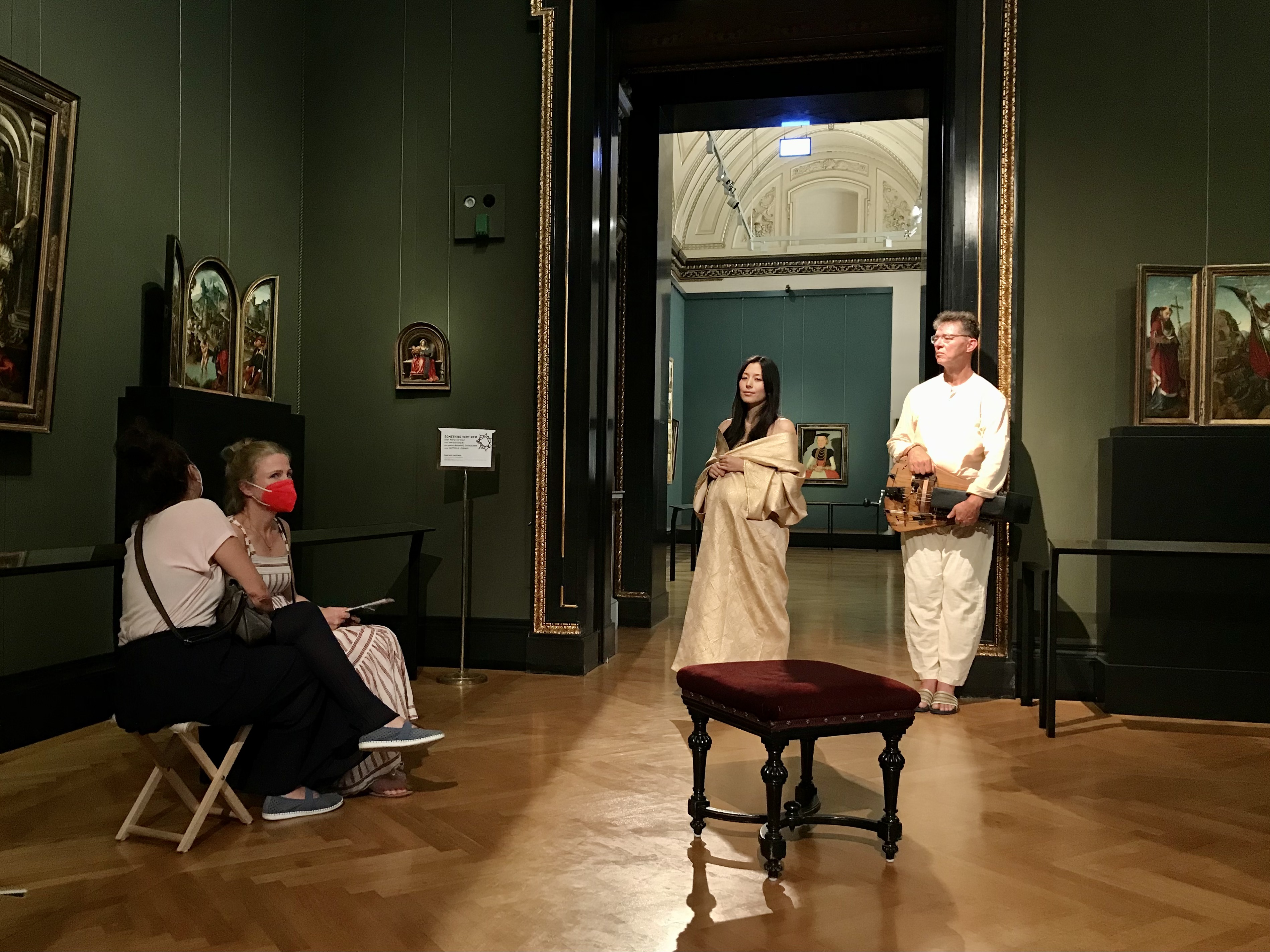 Neben der abgestimmten Glitzerkleidung der Künstler fallen dieses Jahr besonders die ausgefallenen Instrumente auf: Ist es eine Mini-E-Geige oder doch eine Gitarre, der Matthias Jakisic diese Töne entlockt? Er begleitet Peter Wolf beim Sinnieren über Pinot Noir. Vor dem Rubens-Gemälde „Cimon und Efigenia“ wird eine Gitarre mit zwei Hälsen bearbeitet und neben dem Mini-Bild „Maria mit Kind“ liefert eine Drehleier den Soundtrack zu den Freuden und Ängsten einer tatsächlich hochschwangeren Manaho Shimokawa. Das Instrument am Schoß von Verena Zeiner kennt man schließlich: Mit Keyboard begleitet sie einen Stopp Motion-Film über den Baby-Drachen, dessen Papa vom Heiligen Georg am Gemälde nebenan erstochen wurde.