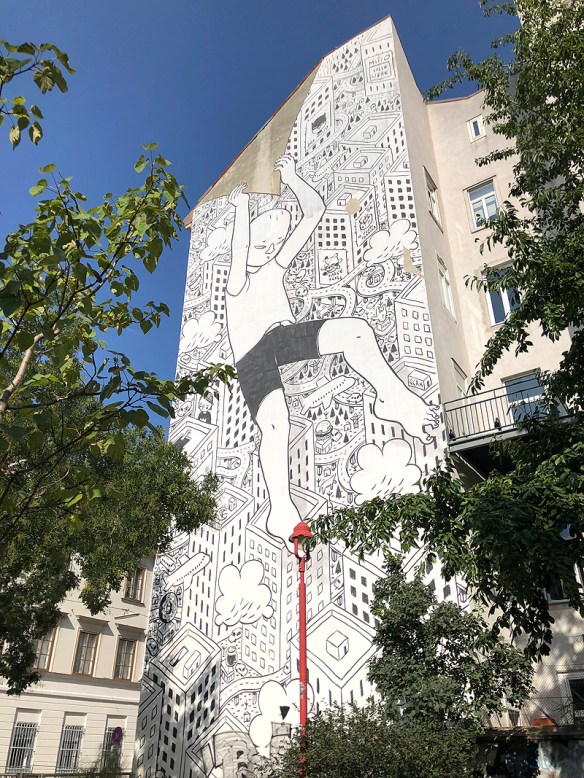 Freundliche Figuren in Schwarz-Weiß sind das Markenzeichen des Künstlers und Illustrators Millo. Weltweit malt der Italiener sie auf Hauswände. Ein Kunstwerk mit dem Titel „Unsticker“ wurde 2015 an einem Wochenende für das Calle Libre– Festival in Wien gemalt. Es lädt mit vielen Details zum Entdecken ein und erinnert damit an ein Wimmelbild aus Kinderbüchern. Praktischerweise befindet sich das Wandbild in der Andreasgasse neben einem Spielplatz.