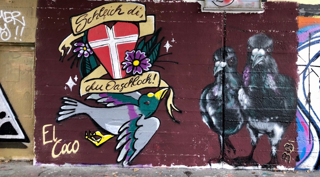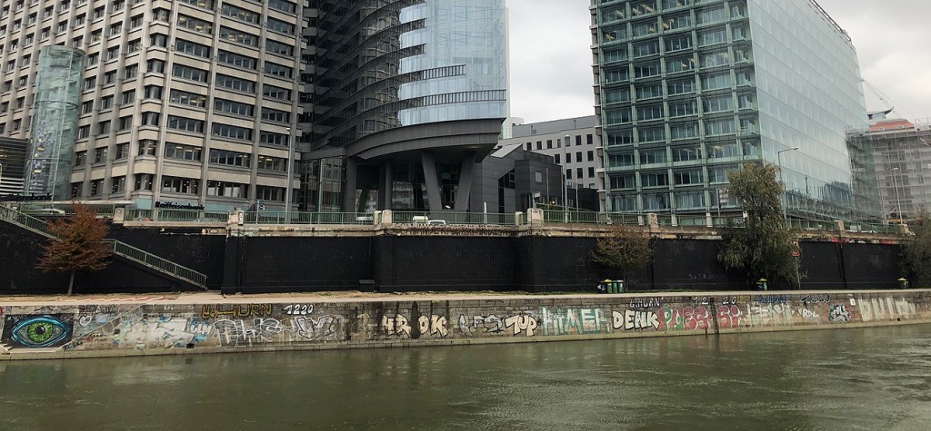 Die fast 300 Meter lange schwarze Wand ist als Zeichen der Trauer unübersehbar: In Gedenken an die Opfer des Terroranschlags in Wien haben Sprayer gegenüber vom Schwedenplatz die Graffitis am Donaukanal mit schwarzer Farbe übermalt. Wer ein paar Meter weiter einen genaueren Blick wagt, findet außerdem erste Kunstwerke, die auf das Attentat Bezug nehmen: Neben Herzen und Friedenstauben wurde etwa der berühmte, aber wohl nie so gerufene Satz „Schleich di, du Oaschloch!“ bei der Freda-Meissner-Blau-Promenade gesprayt.