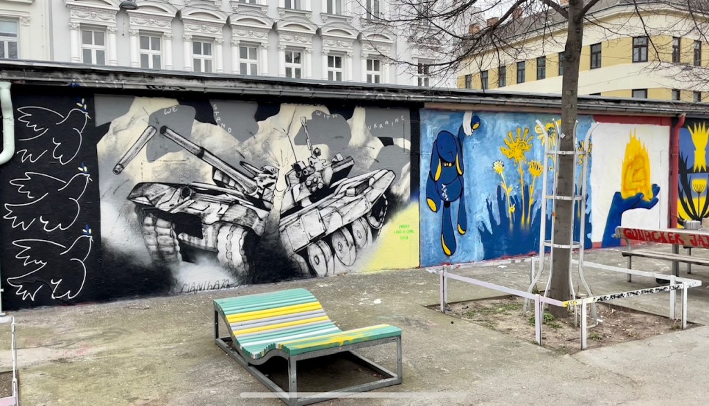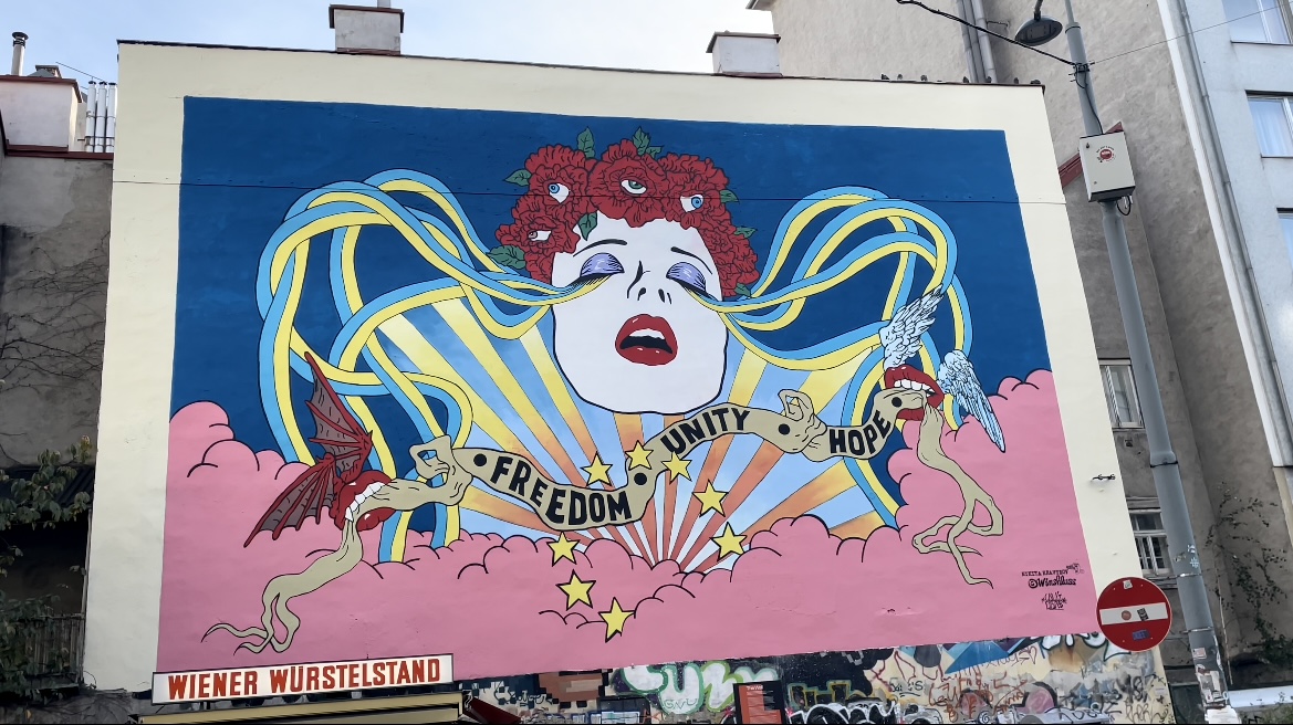 Neue Kunstwerke in Wien bilden das aktuelle Weltgeschehen ab: Der ukrainische Street-Art-Künstler Nikita Kravtsov etwa hat in der Pfeilgasse eine weinende Frau auf eine Hausmauer gemalt. Das riesige Wandbild über dem „Wiener Würstelstand“ erinnert an Gustav Klimts Frauenporträts und ist Teil des europaweiten Kunstprojekts „The Wall“. Ziel ist es, die Ukraine in Wien – wo es eine hohe russische Präsenz gibt – sichtbarer zu machen. Auch in Berlin, Genf, Marseille und Ankara sollen solche Murals entstehen.