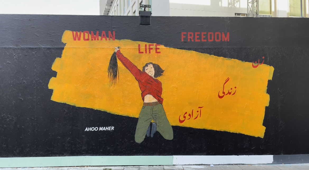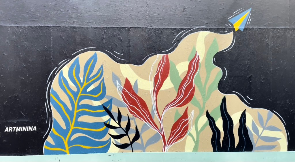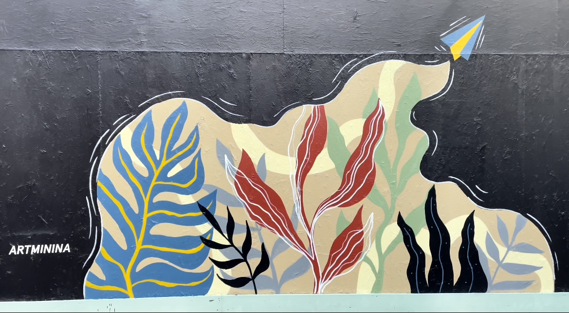 Street-Art beschäftigt sich auch am Bauzaun des Wien Museums mit den Krisen unserer Zeit. Die Künstlerin Artminina aus Odessa setzt sich mit mit einem blau-gelben Paperflieger für Frieden in der Ukraine ein und Künstlerin Ahoo Maher thematisiert die Freiheitsproteste gegen das Regime im Iran.