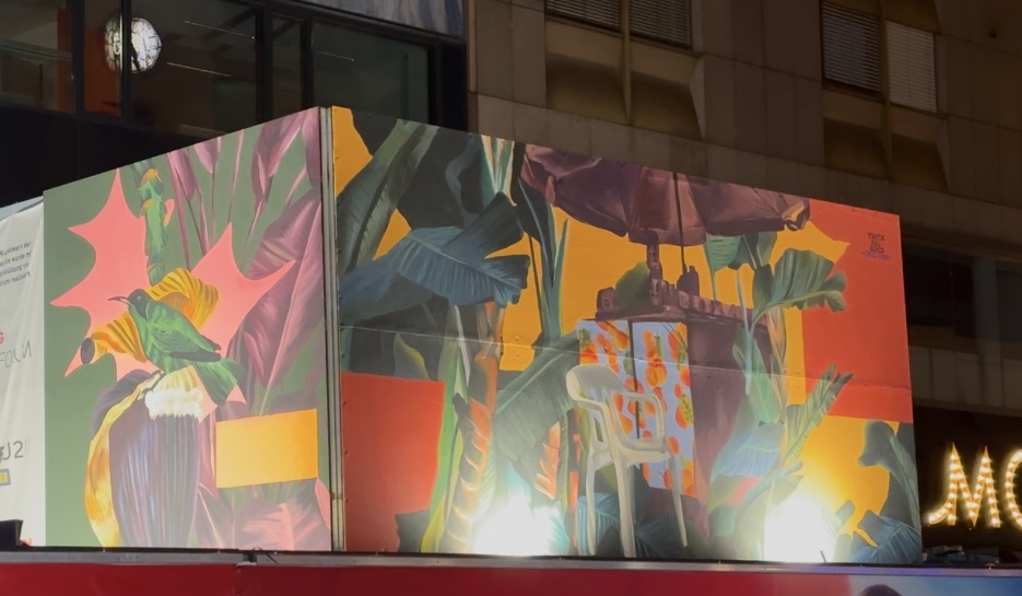 Die kolumbianische Künstlerin Tinta del Rio hat die U2-Baustelle auf der Mariahilferstraße in Wien mit einer bunten Tropenlandschaft verschönert. Tagsüber gehen ihre Bilder im Trubel unter. Aber in der Nacht werden sie beleuchtet und sind ein Blickfang.