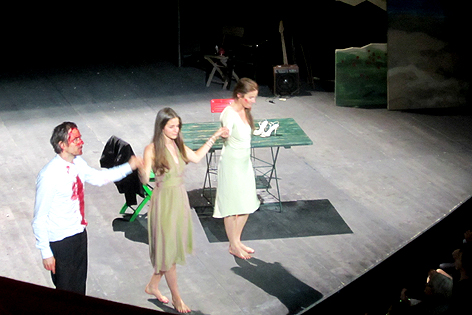 Vor dem Bühnenbild ist ein Orchestergraben mit vielen Sesseln und Notenständern aufgebaut. Auf Musiker wartet man aber vergeblich. Diese werden durch Verstärker und Lautsprecher ersetzt, die auf den Sesseln platziert wurden. Den Chor bilden die Schauspieler auf der Bühne. Sie singen teils furchtbar falsch, aber mit Begeisterung, manchmal aber auch erstaunlich richtig und mehrstimmig. Einen Dirigenten (Clemens Sienknecht) gibt es auch. Er begleitet den Abend am Klavier und als Sänger. Das Hauptthema bildet Frédéric Chopins „Marche funèbre in b-Moll“. Dazwischen werden andere Begräbnislieder wie „Der gute Kamerad“ oder „Der Tod und das Mädchen“ dargeboten. Die Musik wird immer verfälscht. Es klingt, als würde ein Teil des Orchesters während der Stücke noch mit dem Stimmen beschäftigt sein. Höhepunkt ist der Radetzkymarsch, der, gemischt mit Maschinengewehr- und Bombengeräuschen, unertäglich laut abgespielt wird. Allein schon wegen der schrägen Musik ist diese Inszenierung empfehlenswert!
