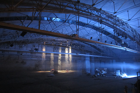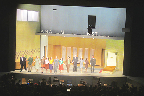 Zum einen war die Halle E im Museumsquartier derart heruntergekühlt, dass man als Besucher glauben konnte, sich in der Kühlkammer des Anatomieinstitutes zu befinden, das auf der Bühne zu sehen war. Das Stück beginnt mit einem kurzen, wortlosen Sketch, der an ein Vorprogramm im Kino erinnert. Ein Mann steigt auf eine Leiter, um den Schriftzug „Anatomieinstitut“ zu vervollständigen. Dann bricht die Leiter zusammen. Begleitet wird er von E-Gitarrenmusik.