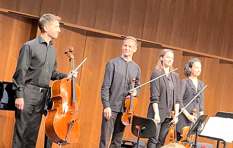 Das Umia Quartett spielte das Kaiserquartett von Papa Haydn, dem „Gründer des Streichquartetts“, den „Langsamen Satz“ von Anton Webern sowie Filmmusik aus Mishima von Philip Glass – und klang dabei raumfüllend wie ein Orchester. Faszinierend! Zwischendurch verrieten sie, wie Musikerinnen und Musiker für solch ein Kammerkonzert Stücke auswählen: 1) Mein Instrument ist wichtig. 2) Es ist leicht zu spielen. 3) Die Bratschistin ist schuld.